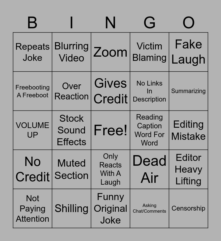 This bingo card has a free space and 36 words: Actual Insight, No Reaction, Nothing Burger, Over Reaction, Dead Air, No Credit, Gives Credit, "What is that", Fake Laugh, Discord Plug, Stock Sound Effects, Victim Blaming, Pointless Editing, Reading Caption Word For Word, Summarizing, Repeats Joke, Random Tangent, Muted Section, Censorship, Zoom, Editing Mistake, Editor Heavy Lifting, Shilling, Not Paying Attention, Funny Original Joke, Blurring Video, VOLUME UP, Bit Cringe Innit, No Links In Description, Freebooting A Freeboot, "Bro", Replays Video, Asking Chat/Comments, Only Reacts With A Laugh, Reactor Off Screen Mining and "That Was It?".