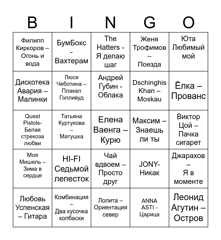 This bingo card has 36 words: Жанна Фриске – А на море белый песок, Винтаж – Плохая девочка, 5sta Family – Я буду, Люся Чеботина – Плакал Голливуд, JONY- Никак, Моя Мишель – Зима в сердце, Андрей Губин - Облака, Леонид Агутин – Ай-ай-ай, Юта Любимый мой, Сергей Трофимов – Город Сочи, Татьяна Куртукова – Матушка, Женя Трофимов – Поезда, Григорий Лепс – Рюмка водки, Максим – Знаешь ли ты, Ёлка – Прованс, Филипп Киркоров – Огонь и вода, Леонид Агутин – Остров, HI-FI Седьмой лепесток, Елена Ваенга – Курю, The Hatters - Я делаю шаг, Виктор Цой – Пачка сигарет, Джарахов – Я в моменте, Комбинация – Два кусочка колбаски, Любовь Успенская – Гитара, Лолита – Ориентация север, БумБокс - Вахтерам, Quest Pistols- Белая стрекоза любви, Макс Корж – Жить в кайф, Dschinghis Khan – Moskau, Дискотека Авария – Малинки, Дискотека авария – Фантазёр, CREAM SODA – Никаких больше вечеринок, ANNA ASTI - Царица, Чай вдвоем – Просто друг, NLO – Танцы and Король и Шут – Кукла колдуна.