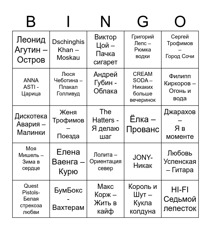 This bingo card has 36 words: Жанна Фриске – А на море белый песок, Винтаж – Плохая девочка, 5sta Family – Я буду, Люся Чеботина – Плакал Голливуд, JONY- Никак, Моя Мишель – Зима в сердце, Андрей Губин - Облака, Юта Любимый мой, Сергей Трофимов – Город Сочи, Татьяна Куртукова – Матушка, Женя Трофимов – Поезда, Григорий Лепс – Рюмка водки, Максим – Знаешь ли ты, Ёлка – Прованс, Филипп Киркоров – Огонь и вода, Леонид Агутин – Остров, HI-FI Седьмой лепесток, Елена Ваенга – Курю, The Hatters - Я делаю шаг, Виктор Цой – Пачка сигарет, Джарахов – Я в моменте, Любовь Успенская – Гитара, БумБокс - Вахтерам, Quest Pistols- Белая стрекоза любви, Макс Корж – Жить в кайф, Dschinghis Khan – Moskau, Дискотека Авария – Малинки, Дискотека авария – Фантазёр, CREAM SODA – Никаких больше вечеринок, ANNA ASTI - Царица, Чай вдвоем – Просто друг, NLO – Танцы, Король и Шут – Кукла колдуна, Лолита – Ориентация север, Комбинация – Два кусочка колбаски and Леонид Агутин – Ай-ай-ай.