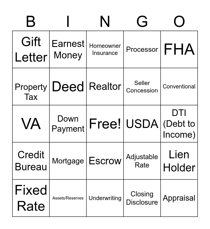 This bingo card has a free space and 24 words: Mortgage, Assets/Reserves, Realtor, Fixed Rate, FHA, Gift Letter, Property Tax, Earnest Money, USDA, Escrow, Seller Concession, VA, Adjustable Rate, Lien Holder, Deed, Closing Disclosure, DTI (Debt to Income), Homeowner Insurance, Conventional, Down Payment, Appraisal, Credit Bureau, Processor and Underwriting.