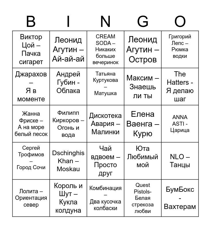 This bingo card has 36 words: Винтаж – Плохая девочка, 5sta Family – Я буду, Моя Мишель – Зима в сердце, Андрей Губин - Облака, Юта Любимый мой, Сергей Трофимов – Город Сочи, Татьяна Куртукова – Матушка, Женя Трофимов – Поезда, Григорий Лепс – Рюмка водки, Ёлка – Прованс, Филипп Киркоров – Огонь и вода, Леонид Агутин – Остров, HI-FI Седьмой лепесток, Елена Ваенга – Курю, The Hatters - Я делаю шаг, Виктор Цой – Пачка сигарет, БумБокс - Вахтерам, Dschinghis Khan – Moskau, Дискотека Авария – Малинки, CREAM SODA – Никаких больше вечеринок, ANNA ASTI - Царица, NLO – Танцы, Король и Шут – Кукла колдуна, Лолита – Ориентация север, Комбинация – Два кусочка колбаски, Леонид Агутин – Ай-ай-ай, Жанна Фриске – А на море белый песок, Макс Корж – Жить в кайф, Максим – Знаешь ли ты, Джарахов – Я в моменте, JONY- Никак, Дискотека авария – Фантазёр, Quest Pistols- Белая стрекоза любви, Чай вдвоем – Просто друг, Любовь Успенская – Гитара and Люся Чеботина – Плакал Голливуд.