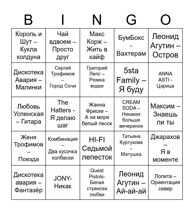 This bingo card has 36 words: Моя Мишель – Зима в сердце, Андрей Губин - Облака, Юта Любимый мой, Сергей Трофимов – Город Сочи, Татьяна Куртукова – Матушка, Женя Трофимов – Поезда, Григорий Лепс – Рюмка водки, Ёлка – Прованс, Леонид Агутин – Остров, Елена Ваенга – Курю, The Hatters - Я делаю шаг, БумБокс - Вахтерам, Dschinghis Khan – Moskau, CREAM SODA – Никаких больше вечеринок, ANNA ASTI - Царица, Король и Шут – Кукла колдуна, Лолита – Ориентация север, Комбинация – Два кусочка колбаски, Жанна Фриске – А на море белый песок, Макс Корж – Жить в кайф, Максим – Знаешь ли ты, Джарахов – Я в моменте, JONY- Никак, Дискотека авария – Фантазёр, Quest Pistols- Белая стрекоза любви, Чай вдвоем – Просто друг, Любовь Успенская – Гитара, Люся Чеботина – Плакал Голливуд, 5sta Family – Я буду, Дискотека Авария – Малинки, NLO – Танцы, Виктор Цой – Пачка сигарет, Леонид Агутин – Ай-ай-ай, HI-FI Седьмой лепесток, Филипп Киркоров – Огонь и вода and Винтаж – Плохая девочка.