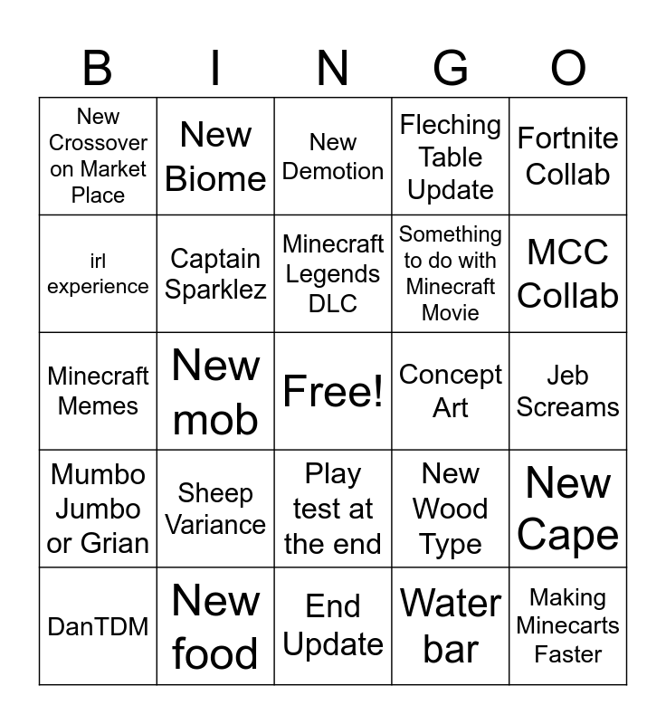 This bingo card has a free space and 24 words: Sheep Variance, New food, Minecraft Legends DLC, DanTDM, Fortnite Collab, New Crossover on Market Place, irl experience, New Biome, Concept Art, Play test at the end, Something to do with Minecraft Movie, Minecraft Memes, New Wood Type, New Cape, Captain Sparklez, Water bar, Jeb Screams, New Demotion, MCC Collab, New mob, Making Minecarts Faster, Mumbo Jumbo or Grian, Fleching Table Update and End Update.