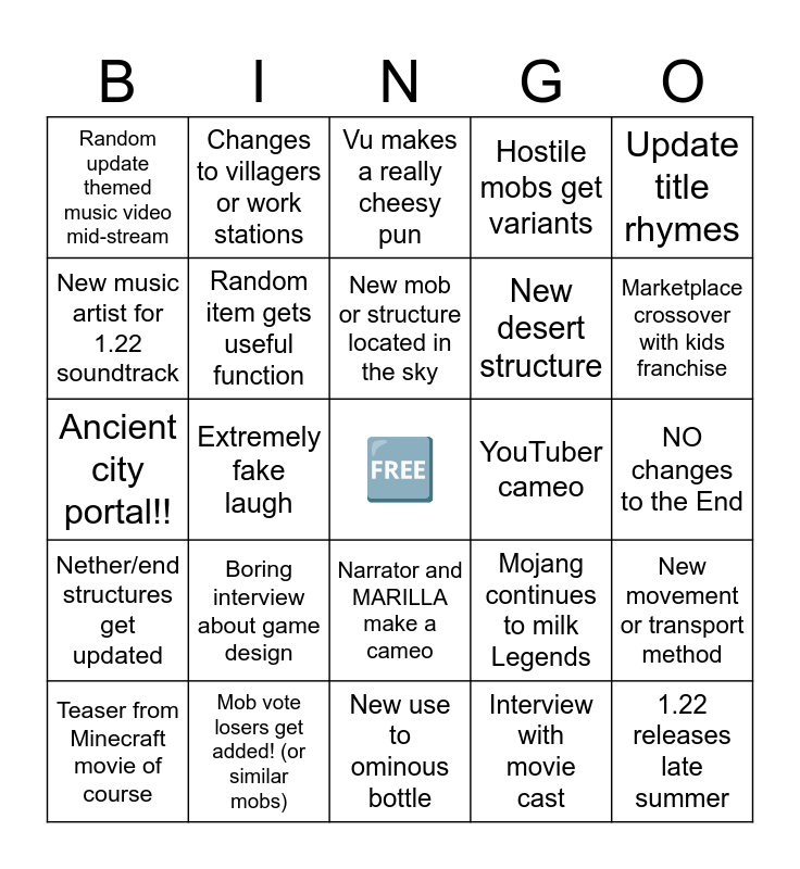 This bingo card has a free space and 24 words: Teaser from Minecraft movie of course, Boring interview about game design, New mob or structure located in the sky, Interview with movie cast, Update title rhymes, Random update themed music video mid-stream, Changes to villagers or work stations, Vu makes a really cheesy pun, YouTuber cameo, NO changes to the End, Ancient city portal!!, Random item gets useful function, Mojang continues to milk Legends, New movement or transport method, New music artist for 1.22 soundtrack, Mob vote losers get added! (or similar mobs), New use to ominous bottle, Hostile mobs get variants, Marketplace crossover with kids franchise, Nether/end structures get updated, Extremely fake laugh, Narrator and MARILLA make a cameo, New desert structure and 1.22 releases late summer.