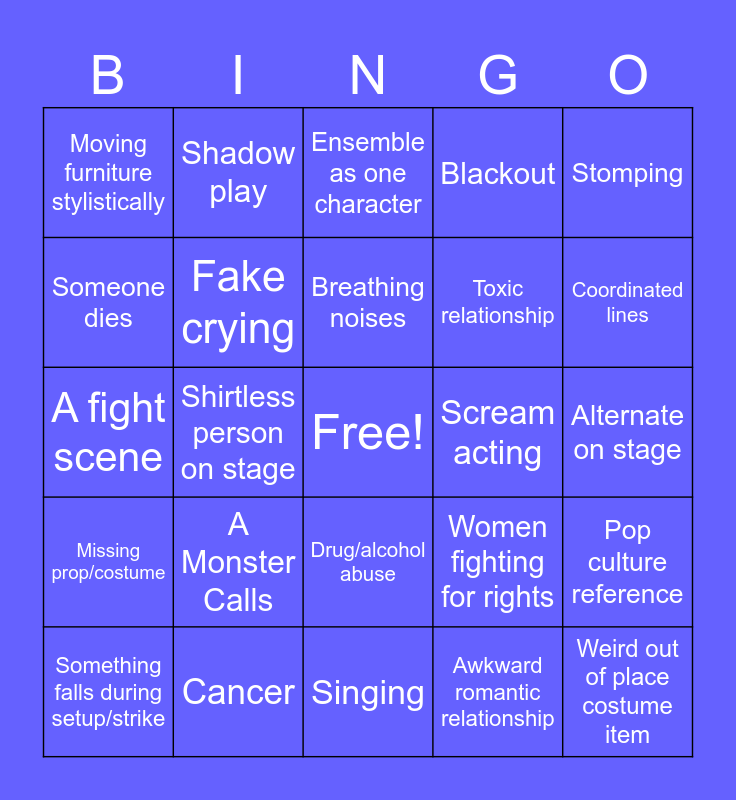 This bingo card has a free space and 24 words: A Monster Calls, Cancer, Breathing noises, Something falls during setup/strike, Stomping, Moving furniture stylistically, Someone dies, Shadow play, Scream acting, Drug/alcohol abuse, Toxic relationship, A fight scene, Women fighting for rights, Pop culture reference, Fake crying, Awkward romantic relationship, Alternate on stage, Ensemble as one character, Coordinated lines, Shirtless person on stage, Weird out of place costume item, Missing prop/costume, Blackout and Singing.