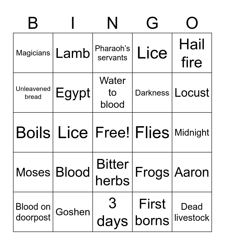 This bingo card has a free space and 24 words: Blood, Goshen, Water to blood, Blood on doorpost, Hail fire, Magicians, Unleavened bread, Lamb, Flies, Bitter herbs, Darkness, Boils, Frogs, Aaron, Egypt, First borns, Midnight, Pharaoh’s servants, Locust, Lice, Dead livestock, Moses, Lice and 3 days.