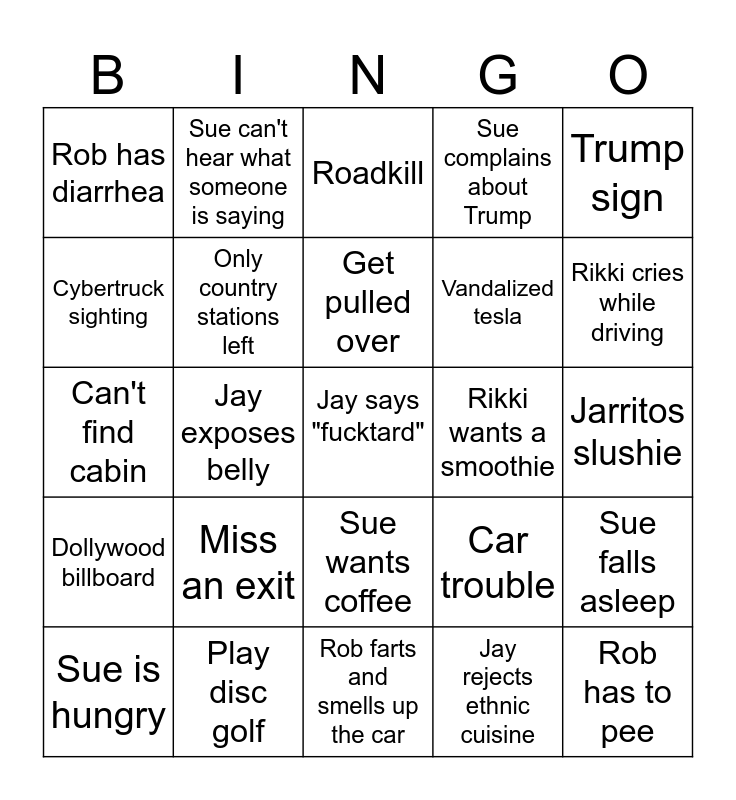 This bingo card has a free space and 24 words: Sue is hungry, Miss an exit, Get pulled over, Jay rejects ethnic cuisine, Trump sign, Rob has diarrhea, Sue can't hear what someone is saying, Roadkill, Rikki wants a smoothie, Jarritos slushie, Can't find cabin, Only country stations left, Car trouble, Sue falls asleep, Cybertruck sighting, Play disc golf, Rob farts and smells up the car, Sue complains about Trump, Rikki cries while driving, Dollywood billboard, Jay exposes belly, Sue wants coffee, Vandalized tesla and Rob has to pee.