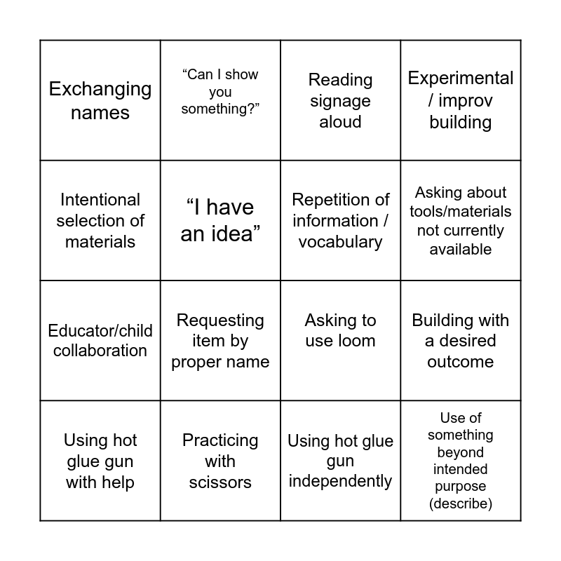 This bingo card has 40 words: Cool looking piece of trash, Asking to use loom, Demo / teaching another visitor, Repetition of information / vocabulary, Discussing 3D printer, “I’ve seen/done this before!”, Asking about tools/materials not currently available, “I need something [to perform a function]…”, Intentional selection of materials, Use of something beyond intended purpose (describe), Building with a desired outcome, Experimental / improv building, Using hot glue gun with help, Using hot glue gun independently, Practicing with scissors, Parent/child collaboration, Child/child collaboration, Exchanging names, Educator improvising to meet a need, Reading signage aloud, Taking inspiration from others, Looking through book/s, Educator/child collaboration, “I have an idea”, “I need [material or tool]”, “Can I make [idea]?”, “Last time we were here…”, Admiring a neighbor’s work, Turning item over in hands, “Can you pass that to me?”, Stacking objects, “That’s not quite right / working”, Turn-taking, Changing idea or plan, Requesting item by proper name, Commenting on material properties, Describe the use/function of creation, Describe a plan for what to do next, “Can I show you something?” and Repeating or replicating action/item.