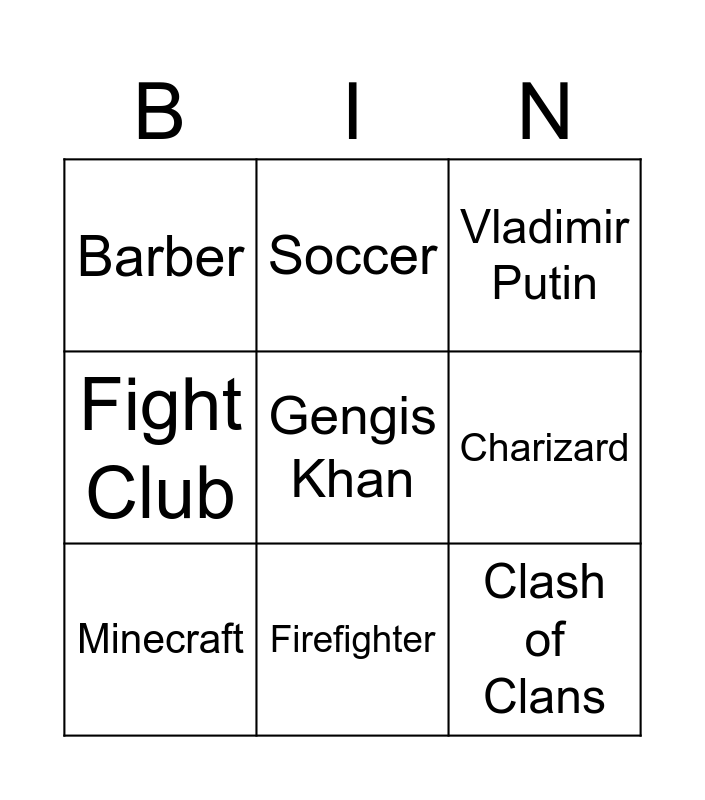 This bingo card has a free space and 8 words: Charizard, Vladimir Putin, Soccer, Minecraft, Barber, Clash of Clans, Fight Club and Firefighter.