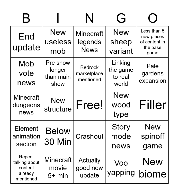 This bingo card has a free space and 24 words: Below 30 Min, Minecraft movie 5+ min, Bedrock marketplace mentioned, Repeat talking about content already mentioned, Less than 5 new pieces of content in the base game, End update, Mob vote news, New useless mob, New wood type, Crashout, Linking the game to real world, Minecraft dungeons news, Story mode news, New spinoff game, Pre show longer than main show, Voo yapping, Filler, Minecraft legends News, Pale gardens expansion, New structure, New biome, Element animation section, New sheep variant and Actually good new update.