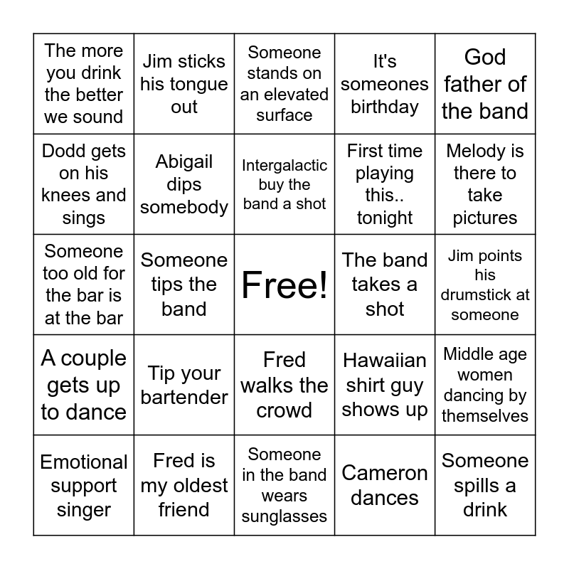 This bingo card has a free space and 24 words: Tip your bartender, Fred is my oldest friend, Intergalactic buy the band a shot, Emotional support singer, God father of the band, The more you drink the better we sound, Dodd gets on his knees and sings, Jim sticks his tongue out, The band takes a shot, Fred walks the crowd, First time playing this.. tonight, Someone too old for the bar is at the bar, Hawaiian shirt guy shows up, Middle age women dancing by themselves, Abigail dips somebody, Cameron dances, Jim points his drumstick at someone, Someone stands on an elevated surface, Melody is there to take pictures, Someone tips the band, Someone spills a drink, A couple gets up to dance, It's someones birthday and Someone in the band wears sunglasses.