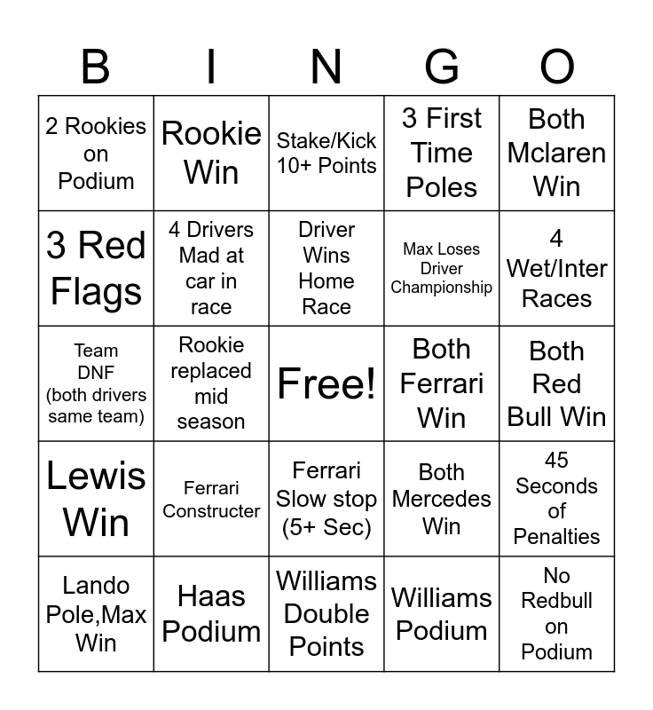 This bingo card has a free space and 24 words: Ferrari Constructer, Haas Podium, Driver Wins Home Race, Lando Pole,Max Win, Both Mclaren Win, 2 Rookies on Podium, 3 Red Flags, Rookie Win, Both Ferrari Win, Ferrari Slow stop (5+ Sec), Max Loses Driver Championship, Team DNF (both drivers same team), Both Mercedes Win, 45 Seconds of Penalties, 4 Drivers Mad at car in race, Williams Podium, Both Red Bull Win, Stake/Kick 10+ Points, 4 Wet/Inter Races, Rookie replaced mid season, No Redbull on Podium, Lewis Win, 3 First Time Poles and Williams Double Points.