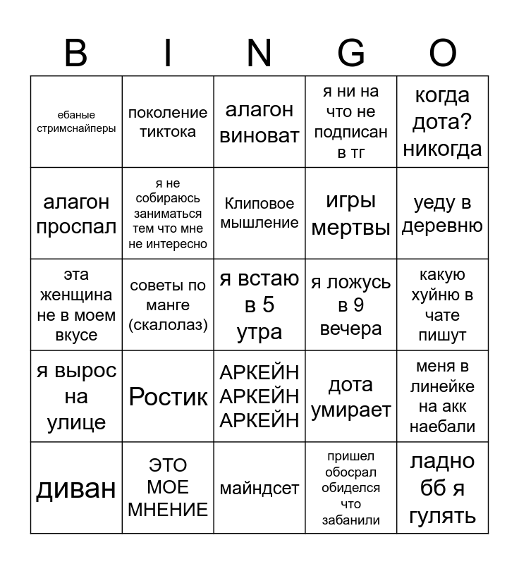 This bingo card has a free space and 24 words: Ростик, ЭТО МОЕ МНЕНИЕ, Клиповое мышление, диван, когда дота? никогда, ебаные стримснайперы, алагон проспал, поколение тиктока, я ложусь в 9 вечера, АРКЕЙН АРКЕЙН АРКЕЙН, игры мертвы, эта женщина не в моем вкусе, дота умирает, меня в линейке на акк наебали, я не собираюсь заниматься тем что мне не интересно, пришел обосрал обиделся что забанили, какую хуйню в чате пишут, алагон виноват, уеду в деревню, советы по манге (скалолаз), ладно бб я гулять, я вырос на улице, я ни на что не подписан в тг and майндсет.