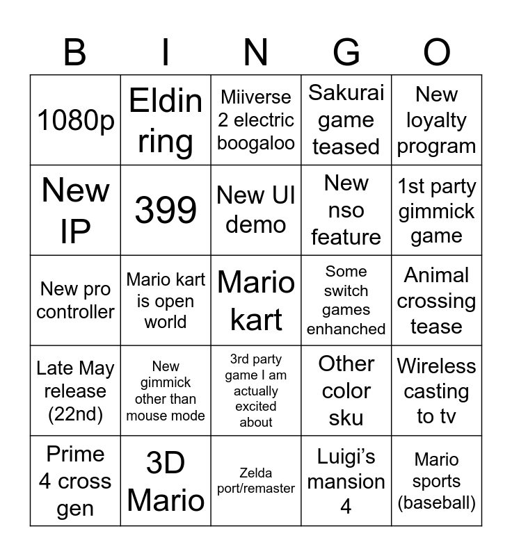 This bingo card has a free space and 24 words: New gimmick other than mouse mode, 3D Mario, New UI demo, Prime 4 cross gen, New loyalty program, 1080p, New IP, Eldin ring, Some switch games enhanched, 3rd party game I am actually excited about, New nso feature, New pro controller, Other color sku, Wireless casting to tv, 399, Luigi’s mansion 4, Animal crossing tease, Miiverse 2 electric boogaloo, 1st party gimmick game, Mario kart is open world, Mario sports (baseball), Late May release (22nd), Sakurai game teased and Zelda port/remaster.