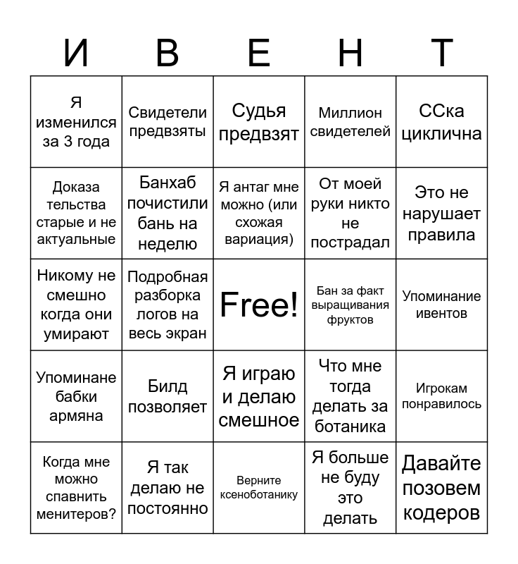 This bingo card has a free space and 24 words: Билд позволяет, Я так делаю не постоянно, Я антаг мне можно (или схожая вариация), Когда мне можно спавнить менитеров?, ССка циклична, Я изменился за 3 года, Доказа тельства старые и не актуальные, Свидетели предвзяты, Бан за факт выращивания фруктов, Я играю и делаю смешное, От моей руки никто не пострадал, Никому не смешно когда они умирают, Что мне тогда делать за ботаника, Игрокам понравилось, Банхаб почистили бань на неделю, Я больше не буду это делать, Упоминание ивентов, Судья предвзят, Это не нарушает правила, Подробная разборка логов на весь экран, Давайте позовем кодеров, Упоминане бабки армяна, Миллион свидетелей and Верните ксеноботанику.