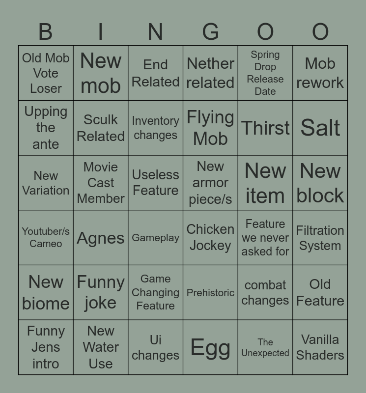 This bingo card has 42 words: The Unexpected, Sculk Related, Predicted Feature, New item, Filtration System, Agnes, New Variation, New Foodtype, End Related, New block, Useless Feature, Flying Mob, Salt, Spring Drop Release Date, New Water Use, Youtuber/s Cameo, Old Feature, Thirst, Vanilla Shaders, New mob, Mob rework, Game Changing Feature, New biome, Old Mob Vote Loser, Sky related, Funny Jens intro, Inventory changes, Recipe changes, Funny joke, combat changes, Unwanted feature, New armor piece/s, Upping the ante, Feature we never asked for, Ui changes, Gameplay, Chicken Jockey, Movie Cast Member, Prehistoric, Egg, Nether related and Vu being Vu.