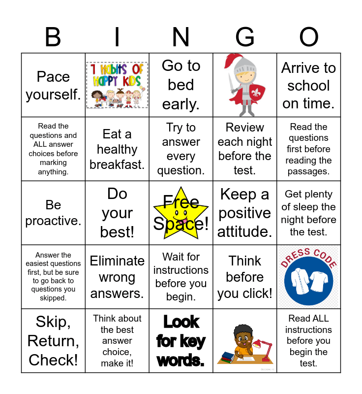 This bingo card has 5 images, a free space and 24 words: Skip, Return, Check!, Check over your work., Do your best!, Read the writing prompt. Only write about the prompt., Pace yourself., Go to bed early., Eat a healthy breakfast., Eliminate wrong answers., Keep a positive attitude., Think about the best answer choice, make it!, Get plenty of sleep the night before the test., Read ALL instructions before you begin the test., Look for key words., Read the questions first before reading the passages., Practice breathing and staying calm., Wait for instructions before you begin., Answer the easiest questions first, but be sure to go back to questions you skipped., Arrive to school on time., Be proactive., Think before you click!, Limit TV, computer, and video games during the week of testing., Review each night before the test., Read the questions and ALL answer choices before marking anything. and Try to answer every question..