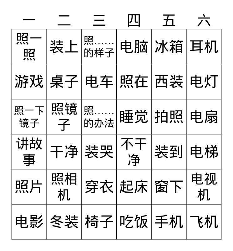 This bingo card has 36 words: 起床, 穿衣, 吃饭, 游戏, 讲故事, 睡觉, 桌子, 椅子, 冰箱, 窗下, 电灯, 电脑, 电视机, 照镜子, 照在, 照一照, 照片, 拍照, 照一下镜子, 照……的样子, 照……的办法, 干净, 不干净, 装哭, 装到, 装上, 西装, 冬装, 电车, 耳机, 飞机, 电影, 电梯, 电扇, 照相机 and 手机.