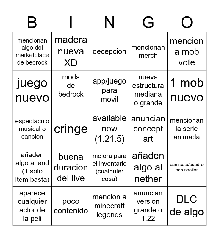 This bingo card has a free space and 24 words: buena duracion del live, poco contenido, app/juego para movil, aparece cualquier actor de la peli, mencion a mob vote, mencionan algo del marketplace de bedrock, juego nuevo, madera nueva XD, anuncian concept art, mejora para el inventario (cualquier cosa), nueva estructura mediana o grande, espectaculo musical o cancion, añaden algo al nether, camiseta/cuadro con spoiler, mods de bedrock, anuncian version grande o 1.22, mencionan la serie animada, decepcion, 1 mob nuevo, cringe, DLC de algo, añaden algo al end (1 solo item basta), mencionan merch and mencion a minecraft legends.