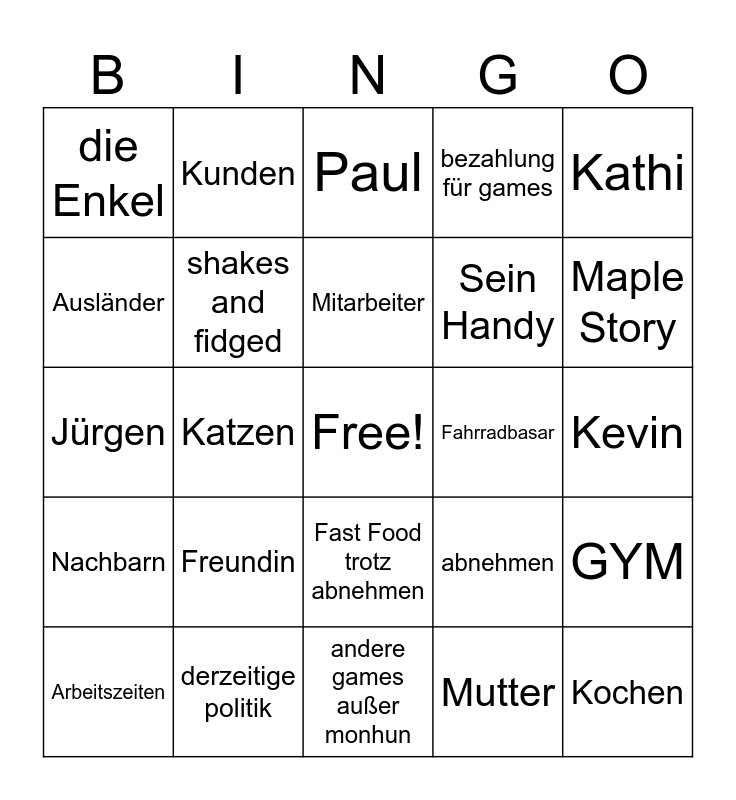This bingo card has a free space and 24 words: Arbeitszeiten, Freundin, Mitarbeiter, Mutter, Kathi, die Enkel, Kunden, Paul, Fahrradbasar, Kevin, Jürgen, shakes and fidged, abnehmen, GYM, Ausländer, derzeitige politik, andere games außer monhun, bezahlung für games, Maple Story, Nachbarn, Katzen, Fast Food trotz abnehmen, Sein Handy and Kochen.
