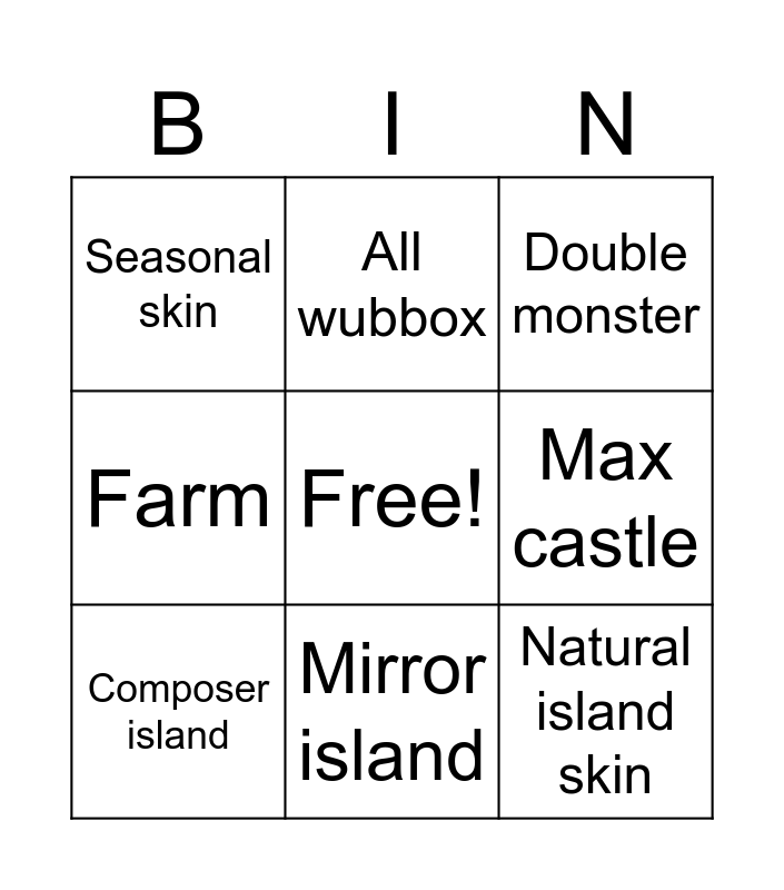 This bingo card has a free space and 8 words: Max castle, Double monster, All wubbox, Composer island, Seasonal skin, Natural island skin, Farm and Mirror island.