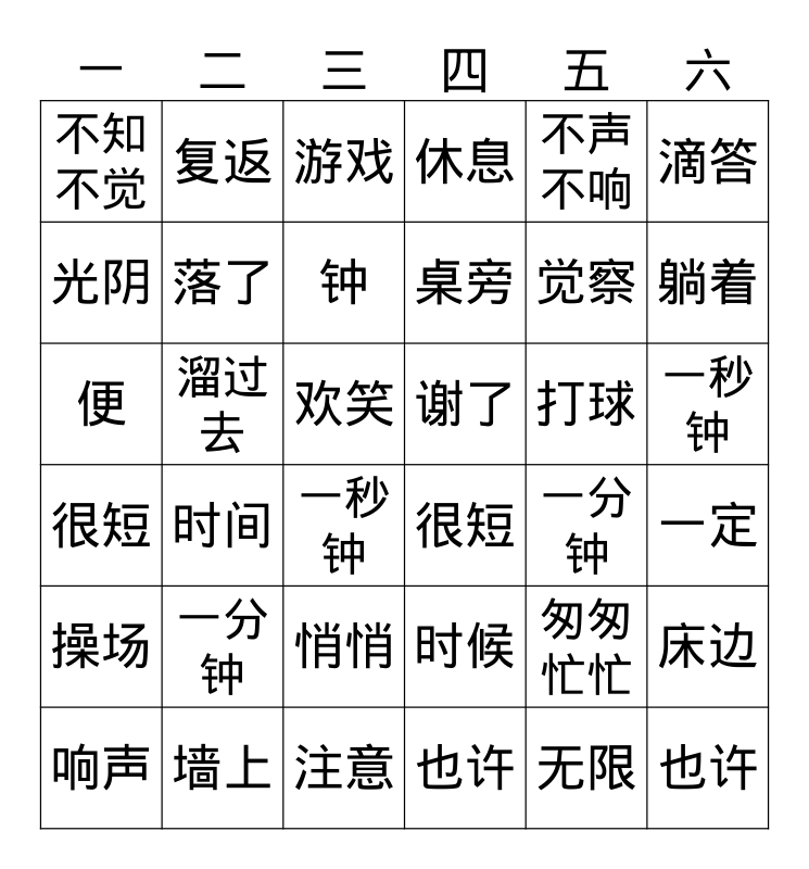 This bingo card has 36 words: 时候, 悄悄, 也许, 光阴, 很短, 谢了, 落了, 注意, 不声不响, 匆匆忙忙, 躺着, 休息, 床边, 溜过去, 桌旁, 不知不觉, 操场, 打球, 便, 游戏, 欢笑, 时间, 很短, 一秒钟, 一分钟, 复返, 觉察, 墙上, 钟, 滴答, 也许, 响声, 一定, 一秒钟, 一分钟 and 无限.