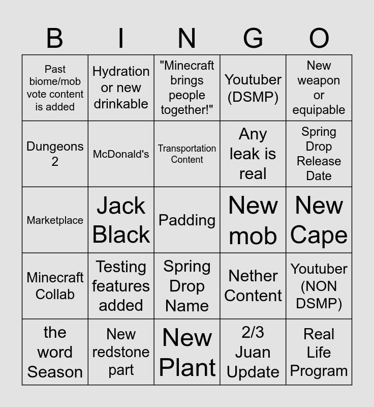 This bingo card has a free space and 25 words: Testing features added, New Plant, Transportation Content, the word Season, New weapon or equipable, Past biome/mob vote content is added, Dungeons 2, Hydration or new drinkable, New mob, Spring Drop Name, Any leak is real, Marketplace, Nether Content, Youtuber (NON DSMP), McDonald's, Someone audibly says "April 2nd", New Cape, "Minecraft brings people together!", Spring Drop Release Date, Jack Black, Real Life Program, New redstone part, Minecraft Collab, Youtuber (DSMP) and 2/3 Juan Update.