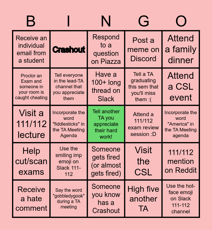 This bingo card has a free space and 24 words: Use the smiling imp emoji on Slack 111-112, Say the word "gobbledygook" during a TA meeting, Have a 100+ long thread on Slack, Receive a hate comment, Attend a family dinner, Receive an individual email from a student, Proctor an Exam and someone in your room is caught cheating, Crashout, Attend a 111/112 exam review session :D, Someone gets fired (or almost gets fired), Tell a TA graduating this sem that you'll miss them :(, Visit a 111/112 lecture, Visit the CSL, 111/112 mention on Reddit, Tell everyone in the lead-TA channel that you appreciate them, High five another TA, Incorporate the word "America" in the TA Meeting agenda, Respond to a question on Piazza, Attend a CSL event, Incorporate the word "fiddlesticks" in the TA Meeting Agenda, Use the hot-face emoji on Slack 111-112 channel, Help cut/scan exams, Post a meme on Discord and Someone you know has a Crashout.