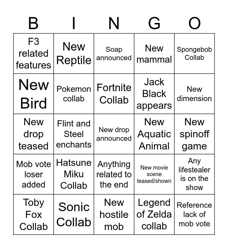 This bingo card has a free space and 24 words: Hatsune Miku Collab, Sonic Collab, Fortnite Collab, Toby Fox Collab, Spongebob Collab, F3 related features, New Bird, New Reptile, New Aquatic Animal, Anything related to the end, Jack Black appears, New drop teased, New movie scene teased/shown, Any lifestealer is on the show, Pokemon collab, Legend of Zelda collab, New spinoff game, Soap announced, New dimension, Flint and Steel enchants, Reference lack of mob vote, Mob vote loser added, New mammal and New hostile mob.