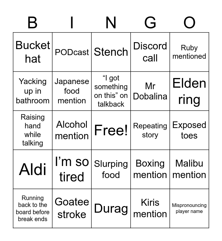 This bingo card has a free space and 24 words: I’m so tired, Goatee stroke, “I got something on this” on talkback, Running back to the board before break ends, Ruby mentioned, Bucket hat, Yacking up in bathroom, PODcast, Repeating story, Slurping food, Mr Dobalina, Raising hand while talking, Boxing mention, Malibu mention, Japanese food mention, Kiris mention, Exposed toes, Stench, Elden ring, Alcohol mention, Mispronouncing player name, Aldi, Discord call and Durag.