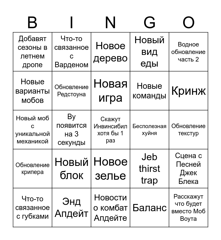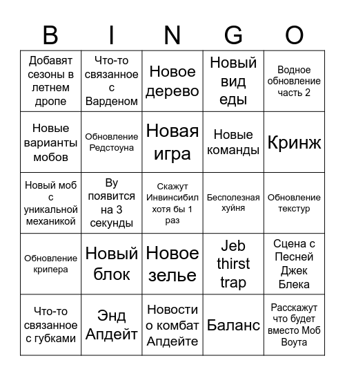 This bingo card has a free space and 24 words: Новый блок, Энд Апдейт, Новая игра, Что-то связанное с губками, Водное обновление часть 2, Добавят сезоны в летнем дропе, Новые варианты мобов, Что-то связанное с Варденом, Бесполезная хуйня, Новое зелье, Новые команды, Новый моб с уникальной механикой, Jeb thirst trap, Сцена с Песней Джек Блека, Обновление Редстоуна, Баланс, Обновление текстур, Новое дерево, Кринж, Ву появится на 3 секунды, Расскажут что будет вместо Моб Воута, Обновление крипера, Новый вид еды and Новости о комбат Апдейте.