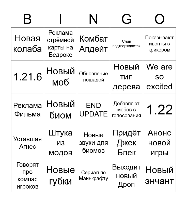 This bingo card has a free space and 24 words: Штука из модов, Новые губки, Обновление лошадей, Говорят про компас игроков, Показывают ивенты с крикером, Новая колаба, 1.21.6, Реклама стрёмной карты на Бедроке, Добавляют мобов с голосования, Новые звуки для биомов, Новый тип дерева, Реклама Фильма, Придёт Джек Блек, Анонс новой игры, Новый моб, Выходит новый Дроп, 1.22, Комбат Апдейт, We are so excited, Новый биом, Новый энчант, Уставшая Агнес, Слив подтверждается and Сериал по Майнкрафту.