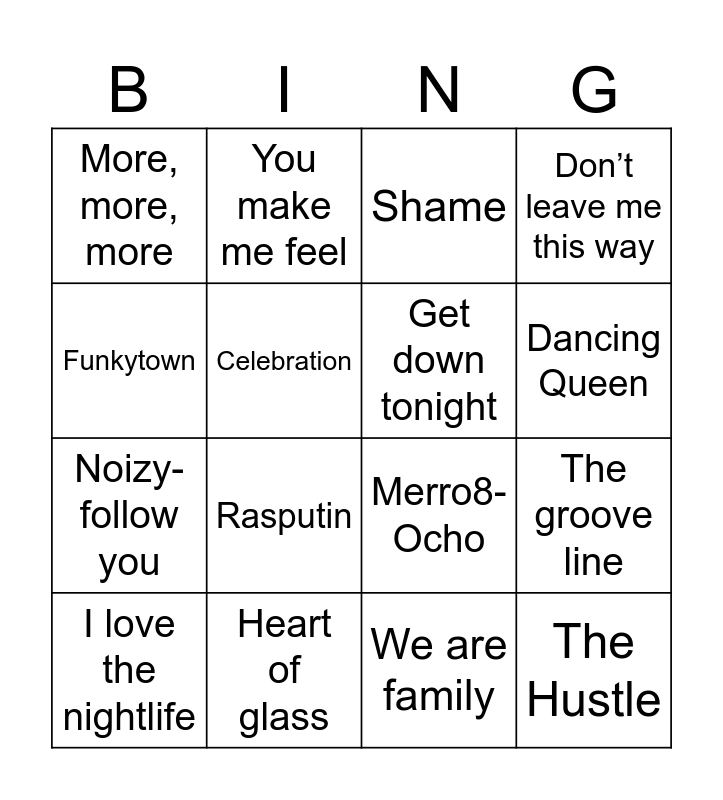 This bingo card has 37 words: Free!, Stayin’ Alive, Boogie oogie boogie, Get down tonight, I will survive, LeFreak, Dancing Queen, I Feel Love, Funkytown, In the navy, The groove line, Don’t leave me this way, I love the nightlife, We are family, Celebration, The Hustle, Boogie wonderland, Shame, Love hangover, Heart of glass, More, more, more, Rasputin, Love machine, Night fever, That’s the way, Knock on wood, You make me feel, Born to be alive, Shake your groove thing, Disco nights, Morad-Pelele, Gilli-Orale, Merro8-Ocho, Soolking-suavemente, Branco,gilli-La danza, Noizy-follow you and Amal-Baghdad.