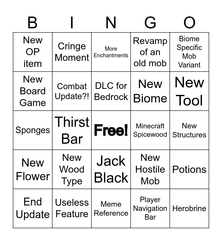 This bingo card has a free space and 24 words: New Wood Type, Useless Feature, DLC for Bedrock, End Update, Biome Specific Mob Variant, New OP item, New Board Game, Cringe Moment, Minecraft Spicewood, Jack Black, New Biome, Sponges, New Hostile Mob, Potions, Combat Update?!, Player Navigation Bar, New Structures, More Enchantments, New Tool, Thirst Bar, Herobrine, New Flower, Revamp of an old mob and Meme Reference.