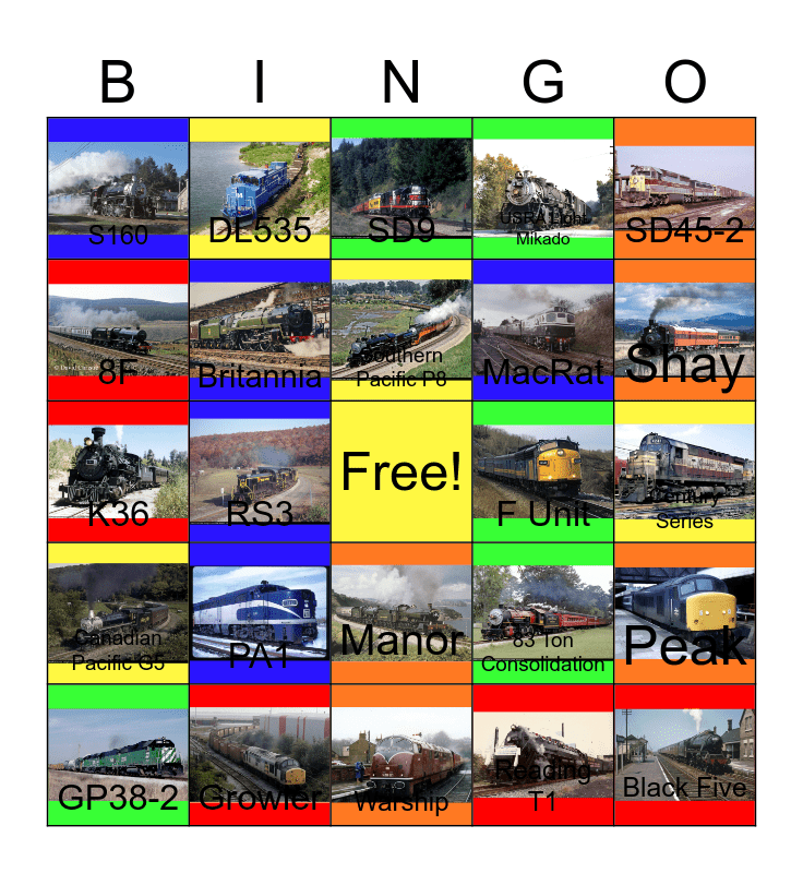 This bingo card has 24 images, a free space and 24 words: PA1, Growler, Southern Pacific P8, GP38-2, SD45-2, S160, 8F, DL535, F Unit, Manor, MacRat, K36, 83 Ton Consolidation, Peak, Britannia, Reading T1, Century Series, SD9, Shay, RS3, Black Five, Canadian Pacific G5, USRA Light Mikado and Warship.