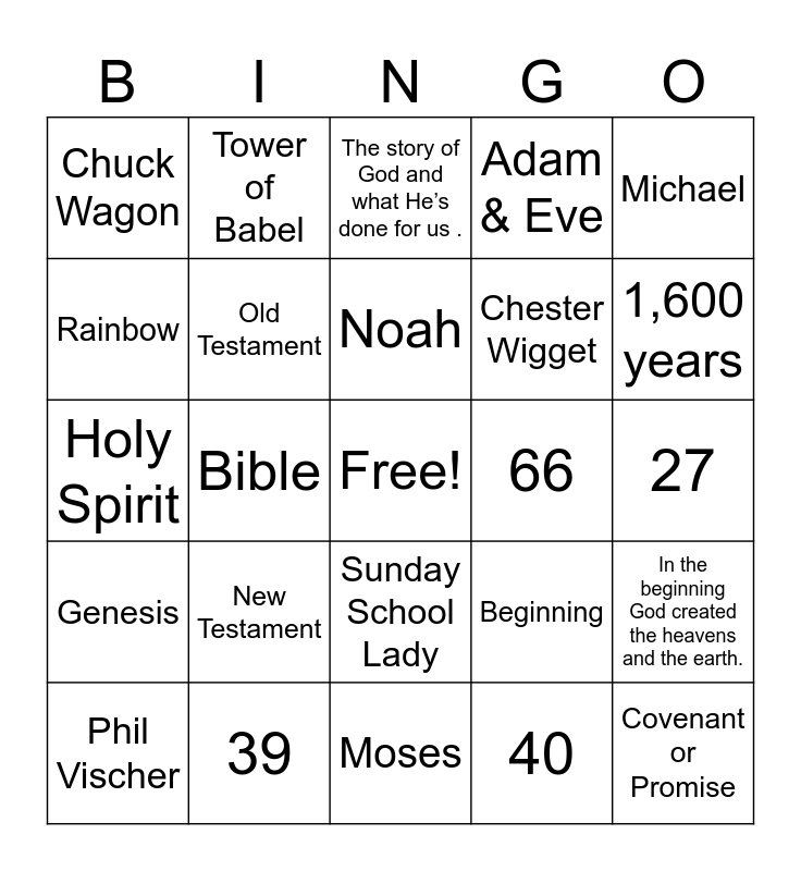 This bingo card has a free space and 29 words: Phil Vischer, Buck Denver, Bible, Clive &Ian, Chuck Wagon, The story of God and what He’s done for us ., Old Testament, New Testament, 66, 39, 27, Covenant or Promise, Moses, 40, 1,600 years, 2, Sunday School Lady, Genesis, Michael, Holy Spirit, Beginning, Paul, Chester Wigget, Rainbow, Adam & Eve, Tower of Babel, In the beginning God created the heavens and the earth., Noah and Snake.