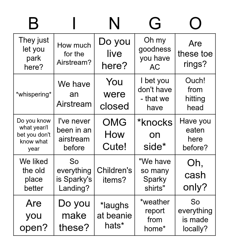 This bingo card has a free space and 24 words: So everything is Sparky's Landing?, Do you make these?, You were closed, Are you open?, Are these toe rings?, They just let you park here?, *whispering*, How much for the Airstream?, *knocks on side*, Children's items?, I bet you don't have - that we have, Do you know what year/I bet you don't know what year, "We have so many Sparky shirts", Oh, cash only?, We have an Airstream, *weather report from home*, Have you eaten here before?, Do you live here?, Ouch! from hitting head, I've never been in an airstream before, So everything is made locally?, We liked the old place better, Oh my goodness you have AC and *laughs at beanie hats*.
