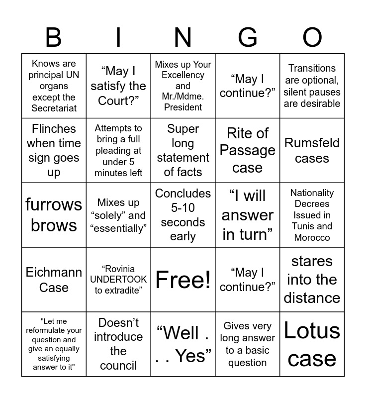 This bingo card has 26 words: Free!, Gives very long answer to a basic question, Super long statement of facts, Doesn’t introduce the council, Transitions are optional, silent pauses are desirable, Knows are principal UN organs except the Secretariat, Flinches when time sign goes up, “May I satisfy the Court?”, Nationality Decrees Issued in Tunis and Morocco, “May I continue?”, Rite of Passage case, furrows brows, stares into the distance, "Let me reformulate your question and give an equally satisfying answer to it", Mixes up “solely” and “essentially”, “Well . . . NO”, “May I continue?”, Eichmann Case, Mixes up Your Excellency and Mr./Mdme. President, Concludes 5-10 seconds early, Rumsfeld cases, “Well . . . Yes”, “I will answer in turn”, “Rovinia UNDERTOOK to extradite”, Attempts to bring a full pleading at under 5 minutes left and Lotus case.