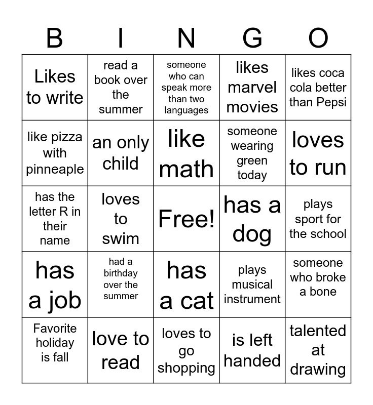 This bingo card has a free space and 24 words: had a birthday over the summer, love to read, like math, Favorite holiday is fall, likes coca cola better than Pepsi, Likes to write, like pizza with pinneaple, read a book over the summer, has a dog, has a cat, someone wearing green today, has the letter R in their name, plays musical instrument, someone who broke a bone, an only child, is left handed, plays sport for the school, someone who can speak more than two languages, loves to run, loves to swim, talented at drawing, has a job, likes marvel movies and loves to go shopping.
