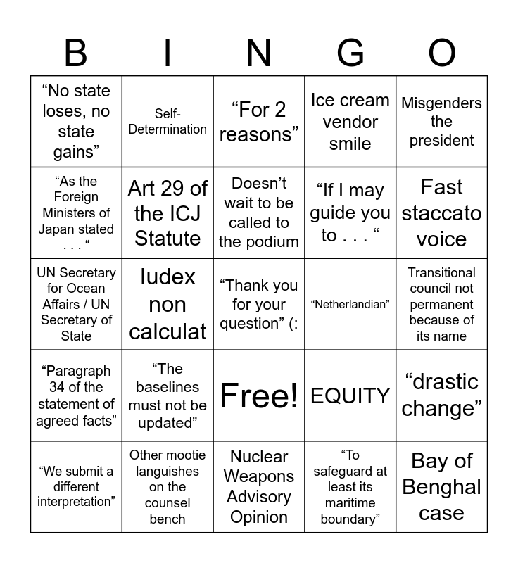 This bingo card has 26 words: Free!, “To safeguard at least its maritime boundary”, Doesn’t wait to be called to the podium, Other mootie languishes on the counsel bench, Misgenders the president, “No state loses, no state gains”, “As the Foreign Ministers of Japan stated . . . “, Self-Determination, Transitional council not permanent because of its name, EQUITY, “If I may guide you to . . . “, UN Secretary for Ocean Affairs / UN Secretary of State, “drastic change”, “We submit a different interpretation”, Iudex non calculat, “plethora of state practice”, Ice cream vendor smile, “Paragraph 34 of the statement of agreed facts”, “For 2 reasons”, “Thank you for your question” (:, Fast staccato voice, Nuclear Weapons Advisory Opinion, “Netherlandian”, “The baselines must not be updated”, Art 29 of the ICJ Statute and Bay of Benghal case.