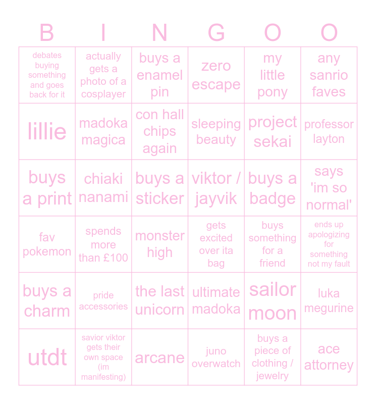 This bingo card has 36 words: ultimate madoka, the last unicorn, juno overwatch, lillie, fav pokemon, viktor / jayvik, madoka magica, arcane, my little pony, sailor moon, professor layton, zero escape, luka megurine, chiaki nanami, sleeping beauty, debates buying something and goes back for it, buys a charm, buys a badge, buys a print, buys a enamel pin, buys a sticker, spends more than £100, gets excited over ita bag, monster high, buys something for a friend, actually gets a photo of a cosplayer, project sekai, savior viktor gets their own space (im manifesting), con hall chips again, any sanrio faves, ace attorney, utdt, ends up apologizing for something not my fault, says 'im so normal', pride accessories and buys a piece of clothing / jewelry.