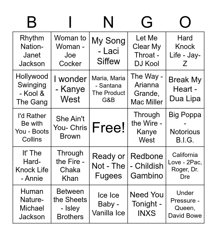 This bingo card has a free space and 29 words: Human Nature- Michael Jackson, Right Here- SWV, She Ain't You- Chris Brown, Thank You - Sly & The Family Stone, Rhythm Nation- Janet Jackson, My Song - Laci Siffew, I wonder - Kanye West, Through the Fire - Chaka Khan, Through the Wire - Kanye West, Between the Sheets - Isley Brothers, Big Poppa - Notorious B.I.G., Under Pressure - Queen, David Bowe, Ice Ice Baby - Vanilla Ice, Need You Tonight - INXS, Break My Heart - Dua Lipa, Ready or Not Here I Come - The Delfonics, Ready or Not - The Fugees, It' The Hard-Knock Life - Annie, Hard Knock Life - Jay- Z, I'd Rather Be with You - Boots Collins, Redbone - Childish Gambino, Still Not A Player - Big Pun, Joe, The Way - Arianna Grande, Mac Miller, Hollywood Swinging - Kool & The Gang, Let Me Clear My Throat - DJ Kool, Woman to Woman - Joe Cocker, California Love - 2Pac, Roger, Dr. Dre, Maria, Maria - Santana The Product G&B and Wild Thoughts - DJ Khaled, Rhianna, Bryson Tiller.