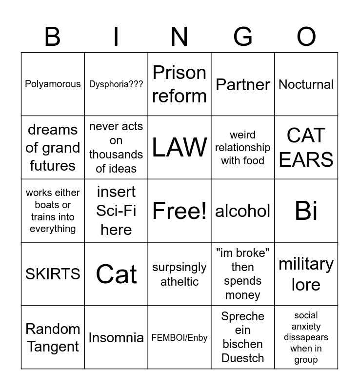 This bingo card has a free space and 24 words: Cat, Insomnia, LAW, Random Tangent, Nocturnal, Polyamorous, dreams of grand futures, Dysphoria???, alcohol, surpsingly atheltic, weird relationship with food, works either boats or trains into everything, "im broke" then spends money, military lore, never acts on thousands of ideas, Spreche ein bischen Duestch, Bi, Prison reform, CAT EARS, insert Sci-Fi here, social anxiety dissapears when in group, SKIRTS, Partner and FEMBOI/Enby.