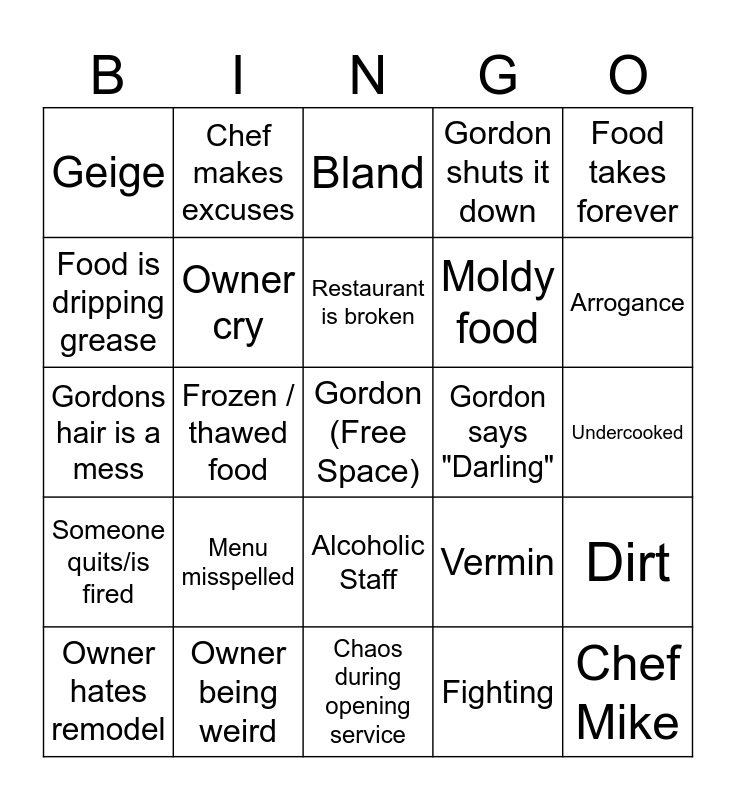 This bingo card has a free space and 24 words: Menu misspelled, Owner being weird, Restaurant is broken, Owner hates remodel, Food takes forever, Geige, Food is dripping grease, Chef makes excuses, Gordon says "Darling", Alcoholic Staff, Moldy food, Gordons hair is a mess, Vermin, Dirt, Owner cry, Fighting, Undercooked, Bland, Arrogance, Frozen / thawed food, Chef Mike, Someone quits/is fired, Gordon shuts it down and Chaos during opening service.