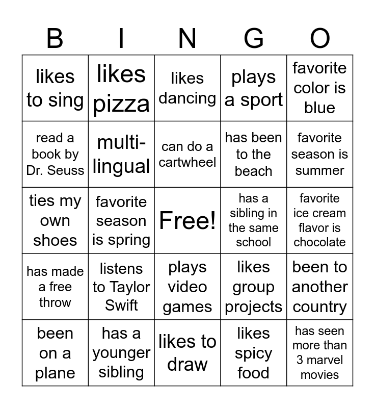 This bingo card has a free space and 24 words: listens to Taylor Swift, has a younger sibling, can do a cartwheel, been on a plane, favorite color is blue, likes to sing, read a book by Dr. Seuss, likes pizza, has a sibling in the same school, plays video games, has been to the beach, ties my own shoes, likes group projects, been to another country, multi-lingual, likes spicy food, favorite ice cream flavor is chocolate, likes dancing, favorite season is summer, favorite season is spring, has seen more than 3 marvel movies, has made a free throw, plays a sport and likes to draw.