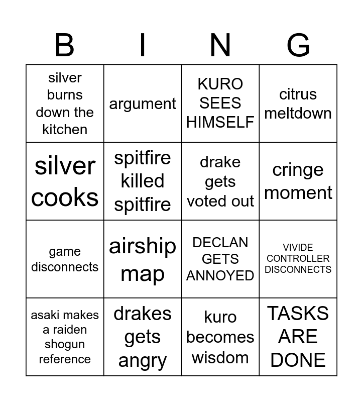 This bingo card has 19 words: DECLAN GETS ANNOYED, DRAKE BECOMES SMART, KURO SEES HIMSELF, TASKS ARE DONE, VIVIDE CONTROLLER DISCONNECTS, silver cooks, kuro becomes wisdom, silver burns down the kitchen, argument, game disconnects, airship map, spitfire killed spitfire, drake gets voted out, drakes gets angry, asaki makes a raiden shogun reference, Confusion moment, citrus meltdown, cringe moment and zoid becomes dumb.
