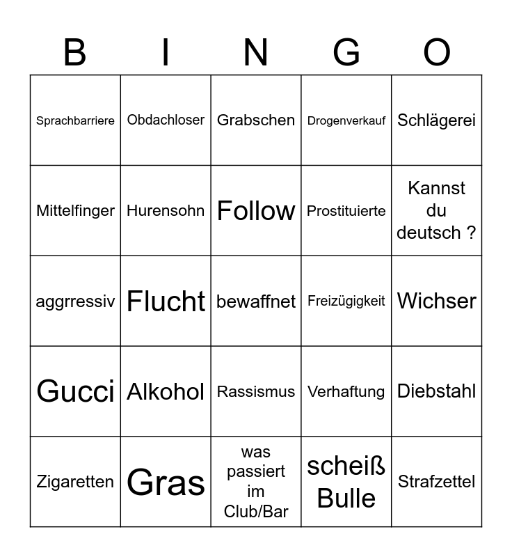 This bingo card has a free space and 24 words: Alkohol, Gras, Follow, Zigaretten, Schlägerei, Sprachbarriere, Mittelfinger, Obdachloser, Freizügigkeit, Rassismus, Prostituierte, aggrressiv, Verhaftung, Diebstahl, Hurensohn, scheiß Bulle, Wichser, Grabschen, Kannst du deutsch ?, Flucht, Strafzettel, Gucci, Drogenverkauf and was passiert im Club/Bar.