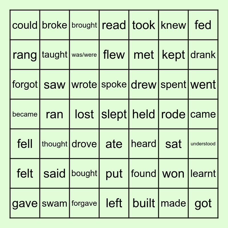 This bingo card has 56 words: made, went, caught, could, ran, bought, fed, did, taught, put, read, felt, fell, came, swam, thought, took, met, got, kept, drank, drove, drew, brought, told, rang, rode, had, was/were, ate, stood, understood, gave, forgave, forgot, knew, flew, said, saw, broke, spoke, slept, found, paid, learnt, wrote, became, left, sat, held, lost, heard, won, built, spent and cut.