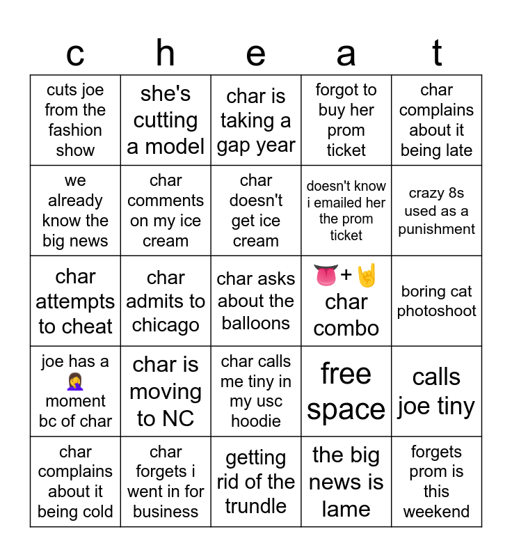 This bingo card has 25 words: char is moving to NC, getting rid of the trundle, char doesn't get ice cream, char complains about it being cold, char complains about it being late, cuts joe from the fashion show, we already know the big news, she's cutting a model, 👅+🤘char combo, char calls me tiny in my usc hoodie, doesn't know i emailed her the prom ticket, char attempts to cheat, free space, calls joe tiny, char comments on my ice cream, forgets prom is this weekend, boring cat photoshoot, char is taking a gap year, crazy 8s used as a punishment, char admits to chicago, char asks about the balloons, char forgets i went in for business, joe has a🤦♀️ moment bc of char, forgot to buy her prom ticket and the big news is lame.