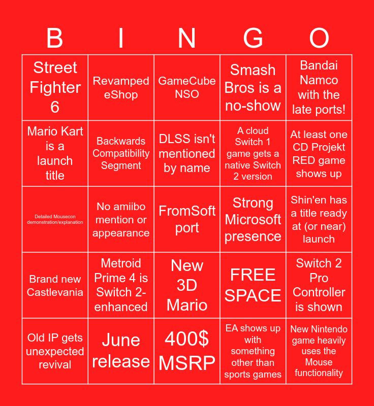 This bingo card has 25 words: Metroid Prime 4 is Switch 2-enhanced, 400$ MSRP, DLSS isn't mentioned by name, Old IP gets unexpected revival, Bandai Namco with the late ports!, Street Fighter 6, Mario Kart is a launch title, Revamped eShop, Strong Microsoft presence, New 3D Mario, A cloud Switch 1 game gets a native Switch 2 version, Detailed Mousecon demonstration/explanation, FREE SPACE, Switch 2 Pro Controller is shown, Backwards Compatibility Segment, New Nintendo game heavily uses the Mouse functionality, Shin'en has a title ready at (or near) launch, GameCube NSO, At least one CD Projekt RED game shows up, No amiibo mention or appearance, FromSoft port, June release, Brand new Castlevania, Smash Bros is a no-show and EA shows up with something other than sports games.